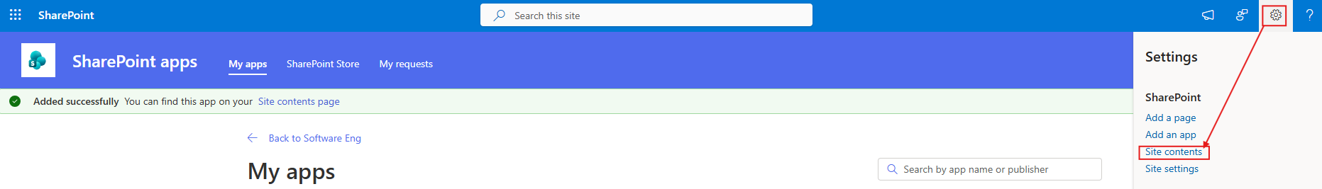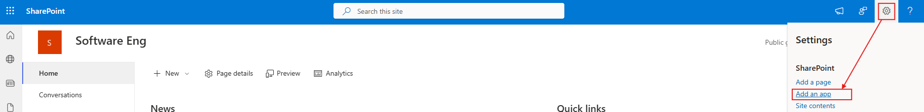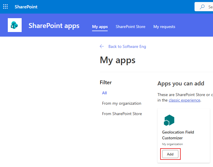Go to the site where you want to use the geolocation field customizer to add the app to the site. Select the gears icon on the top right, and then select Add an app.