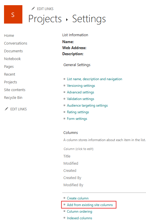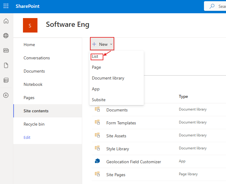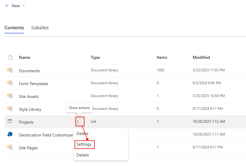 When the list is created, on the Site contents page, select Settings from the menu of the created list