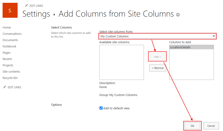 Select the group where the custom field is located (in my case, My Custom Columns), select the LocationDetails field, and click on the Add button, and then click OK.